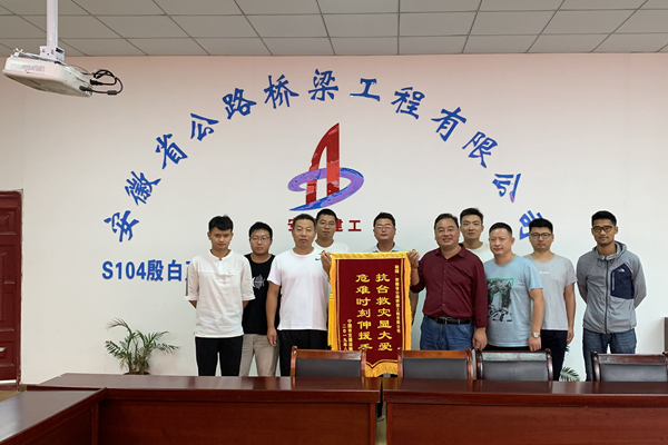 9月4日,寧國市交通運(yùn)輸局副局長程紹忠一行為S104PPP項(xiàng)目送來感謝信和一面書寫著“抗臺(tái)救援顯大愛、危難時(shí)刻伸援手”的錦旗,對(duì)項(xiàng)目近期在支援地方抗洪搶險(xiǎn)中所做的貢獻(xiàn)表示感謝。