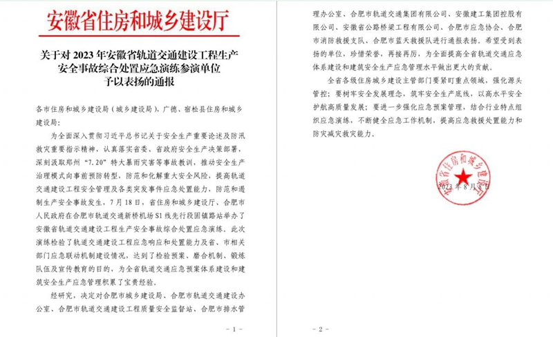 近日,安徽省住房和城鄉(xiāng)建設廳發(fā)文通報表揚安徽建工集團控股有限公司、安徽省公路橋梁工程有限公司在2023年度安徽省軌道交通建設工程綜合處置應急演練中所作出的突出貢獻和優(yōu)異表現(xiàn)。