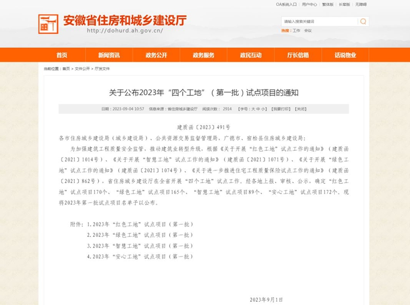 近日,安徽省住房和城鄉(xiāng)建設(shè)廳公布了2023年“四個工地”(第一批)試點項目名單,公司承建的多個項目在全省“四個工地”評比活動中脫穎而出,其中獲評“安心工地”項目3個,“紅色工地”項目4個,“綠色工地”項目4個,“智慧工地”項目1個。