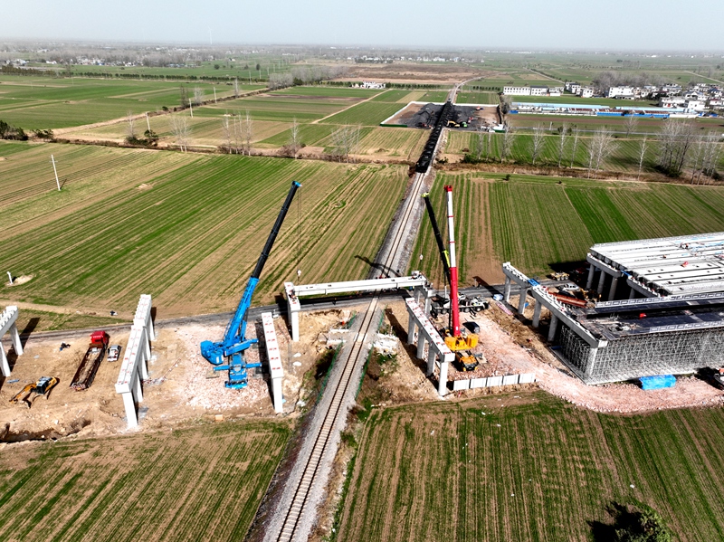 建設(shè)公司徐淮阜高速亳州段路基2標(biāo)跨淮北礦業(yè)鐵路橋“跨鐵”位置第一片箱梁架設(shè)