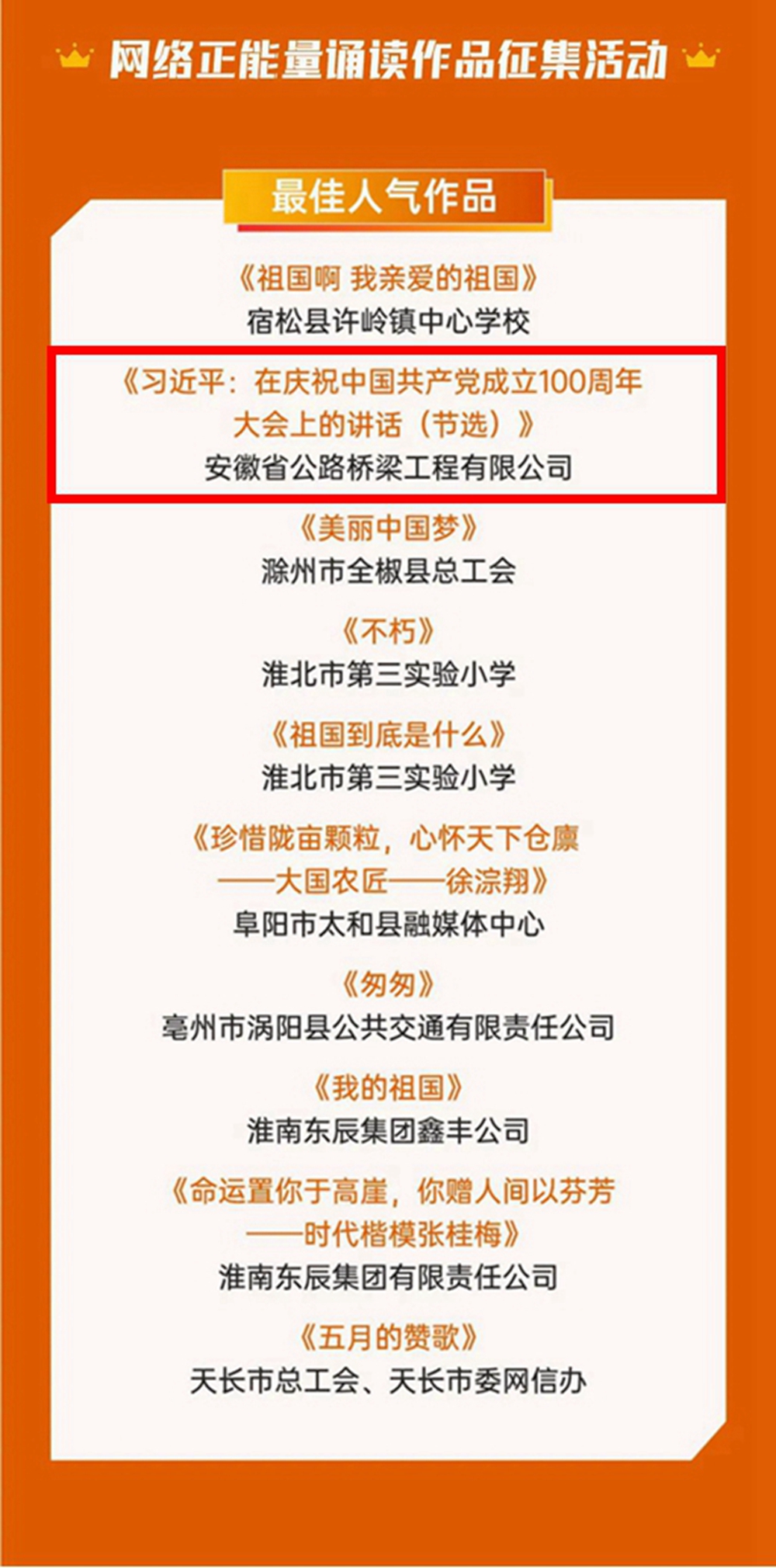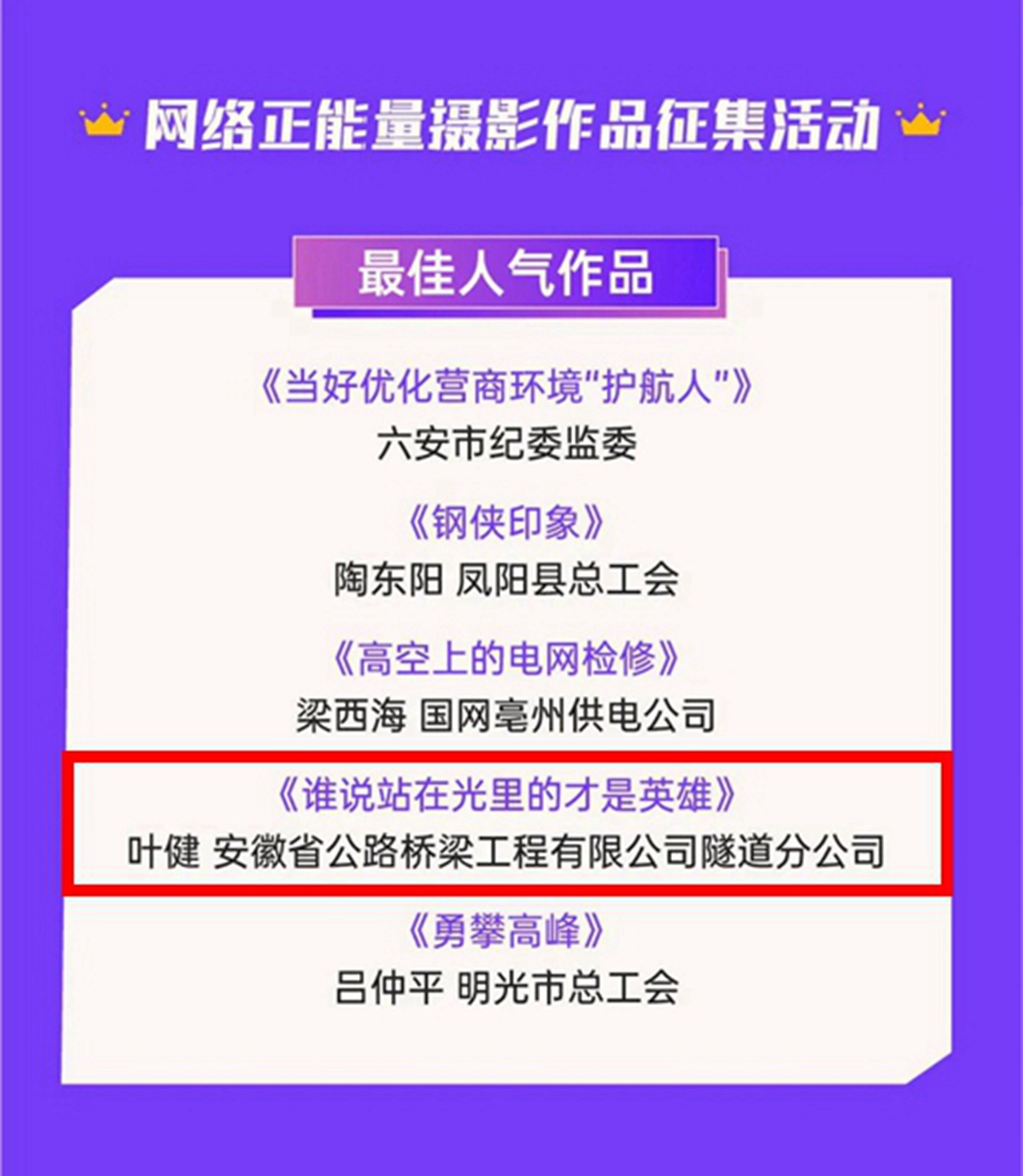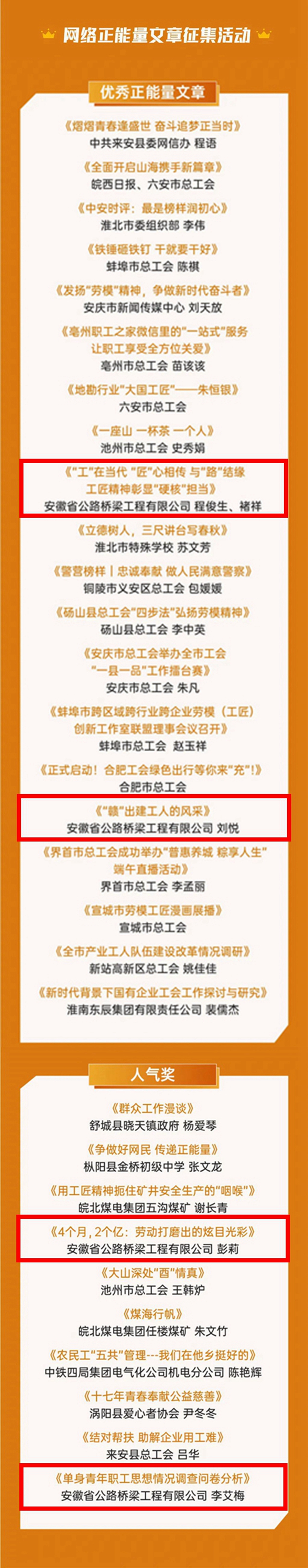 近日,安徽省總工會、省委網(wǎng)信辦聯(lián)合開展的“網(wǎng)聚職工正能量 團結(jié)奮斗新征程”主題活動優(yōu)秀獲獎名單公布,在文章征集、攝影作品征集、誦讀作品征集活動中,公司報送的多個作品獲獎。公司工會被安徽省總工會、省委網(wǎng)信辦聯(lián)合授予2023年全省工會“好網(wǎng)民”主題活動“優(yōu)秀組織單位”。