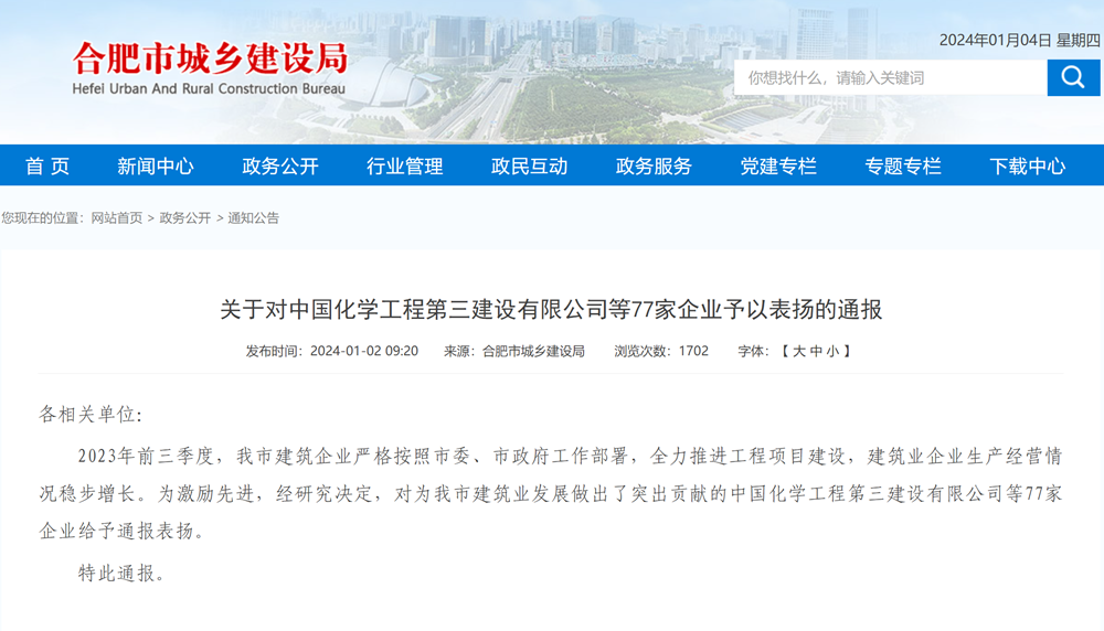 公司獲合肥市城鄉(xiāng)建設局通報表揚