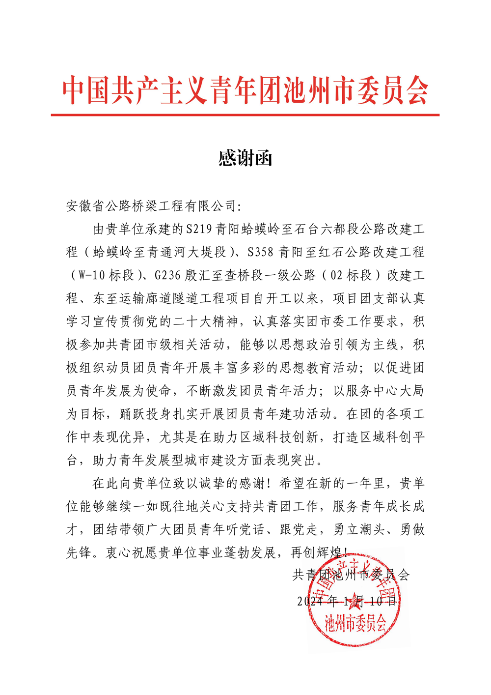 1月10日,公司收到共青團(tuán)池州市委感謝函,對(duì)S219青陽(yáng)蛤蟆嶺至青通河大堤段改建等4個(gè)項(xiàng)目堅(jiān)持黨建帶團(tuán)建,服務(wù)生產(chǎn)經(jīng)營(yíng)工作,尤其是助力打造區(qū)域科創(chuàng)平臺(tái),助力青年發(fā)展型城市建設(shè)方面的突出貢獻(xiàn)給予感謝。
