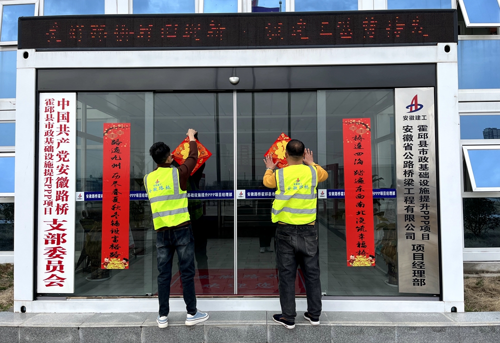 春節(jié)期間,霍邱縣市政基礎(chǔ)設(shè)施提升PPP項目值守人員與工友為項目門窗貼上春聯(lián)、福字,大家一起準備了年夜飯,共度佳節(jié),感受別樣的家的溫暖。