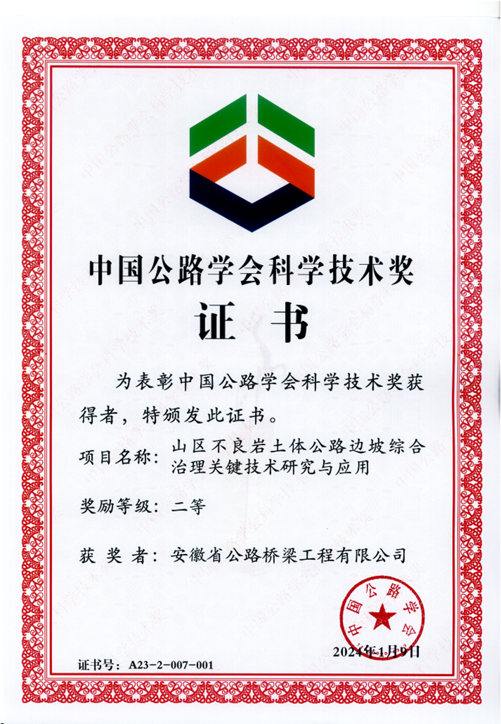 6月28日,中國公路學(xué)會(huì)科學(xué)技術(shù)獎(jiǎng)2023年度頒獎(jiǎng)大會(huì)在青島召開。由公司主持完成的《山區(qū)不良巖土體公路邊坡綜合治理關(guān)鍵技術(shù)研究與應(yīng)用》項(xiàng)目從651個(gè)項(xiàng)目中脫穎而出,榮獲二等獎(jiǎng)。