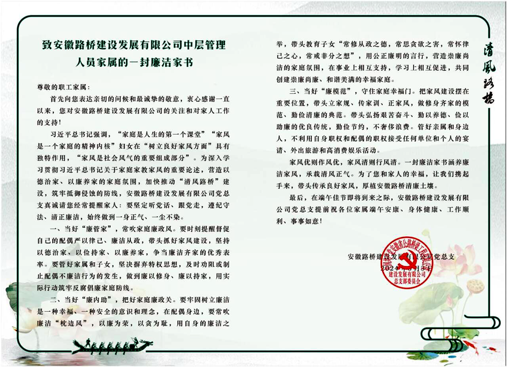 建設(shè)公司深入貫徹落實(shí)集團(tuán)紀(jì)委陽光、清廉、建工“六個(gè)一”廉潔文化創(chuàng)建工作部署,積極推進(jìn)“清廉”之家建設(shè)。組織開展“5·10思廉日”活動(dòng),為50余名管理人員發(fā)放廉潔家書,進(jìn)一步加強(qiáng)家風(fēng)家教建設(shè),將家庭親情融入職工廉潔教育中;組織參與公司紀(jì)委讀書月讀廉書活動(dòng),擇優(yōu)推薦3幅讀廉書作品。組織職工積極參加公司信息化“廉潔知識(shí)測(cè)試”活動(dòng),促進(jìn)黨員干部職工以考促學(xué)、以學(xué)促廉。