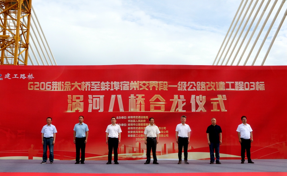 7月20日上午,G206-03標(biāo)渦河八橋主橋順利合龍。蚌埠市副市長(zhǎng)張銘出席合龍儀式并宣布大橋正式合龍,蚌埠市政府副秘書長(zhǎng)張圣輝主持合龍儀式,蚌埠市交通運(yùn)輸局黨委書記、局長(zhǎng)戴勇,懷遠(yuǎn)縣副縣長(zhǎng)趙樹(shù)建,公司黨委書記、董事長(zhǎng)錢申春出席合龍儀式并分別致辭。