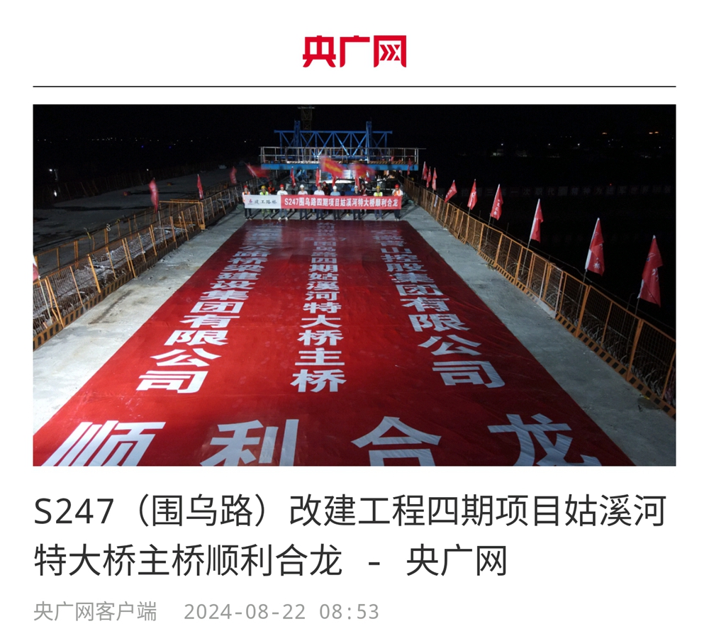 【名媒聚焦】央廣網(wǎng)、學習強國等主流媒體聚焦S247(圍烏路)改建工程四期姑溪河特大橋主橋順利合龍