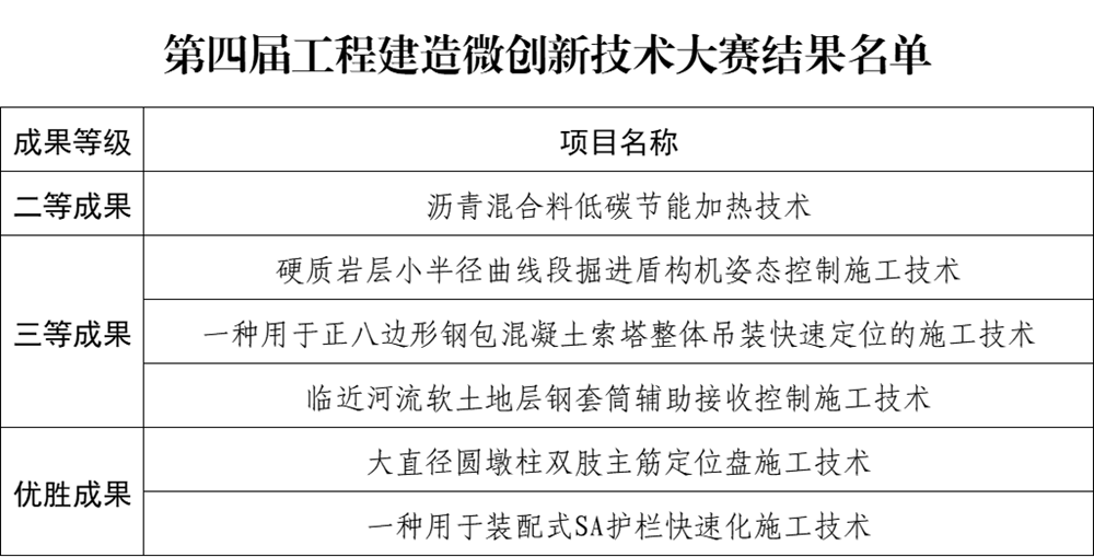 近日,中國施工企業(yè)管理協(xié)會公布第四屆工程建造微創(chuàng)新技術(shù)大賽結(jié)果,經(jīng)形式審查、初賽、復(fù)賽、決賽等環(huán)節(jié)的角逐,公司《瀝青混合料低碳節(jié)能加熱技術(shù)》等6個項(xiàng)目分別榮獲二等成果、三等成果和優(yōu)勝成果。