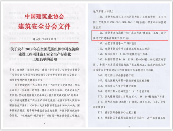 近日,從中國(guó)建筑業(yè)協(xié)會(huì)建筑安全分會(huì)傳來喜訊,公司承建的阜陽(yáng)北路高架01標(biāo)和合寧高速改擴(kuò)建路基路面工程05標(biāo)兩項(xiàng)工程榮獲“2018年全國(guó)建設(shè)工程項(xiàng)目施工安全生產(chǎn)標(biāo)準(zhǔn)化工地”榮譽(yù)稱號(hào)。
