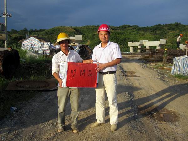 入夏以來,黃祁高速公路建設(shè)沿線地區(qū)持續(xù)高溫,廣大項目員工冒著高溫酷暑始終堅守在一線,為加快施工進度而不懈努力。2010年7月18日下午,我部項目經(jīng)理黃華及項目部主要管理人員深入施工現(xiàn)場,慰問廣大員工,檢查各工區(qū)施工隊伍防暑降溫工作的開展情況,并將防暑降溫用品發(fā)放到各工區(qū)施工隊。