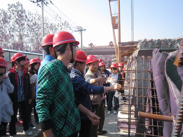 傅總首先對師生們的到來表示歡迎,并簡要介紹了該項(xiàng)目的相關(guān)情況。隨后,該項(xiàng)目熊祖發(fā)為參觀學(xué)生上了一堂精彩的理論課,熊祖發(fā)對照施工進(jìn)度圖向同學(xué)們詳細(xì)介紹了項(xiàng)目施工流程、難點(diǎn)、重點(diǎn)以及工程造價(jià)組成。為加深印象,熊祖發(fā)帶領(lǐng)師生實(shí)地參觀了主橋、鋼桁架梁、預(yù)制梁場等施工現(xiàn)場。每到一處,同學(xué)們都被精致的工藝所折服,紛紛稱贊安徽路橋不愧為一家大企業(yè),并當(dāng)場表達(dá)了加盟路橋公司的愿望。