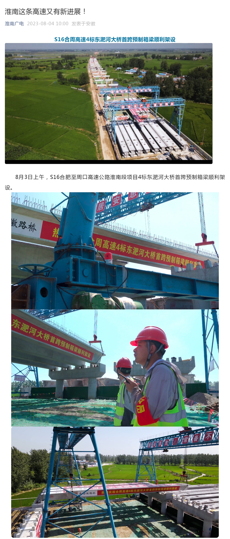 【名媒聚焦】淮南廣播電視臺(tái)——S16合周高速4標(biāo)東淝河大橋首跨預(yù)制箱梁順利架設(shè)