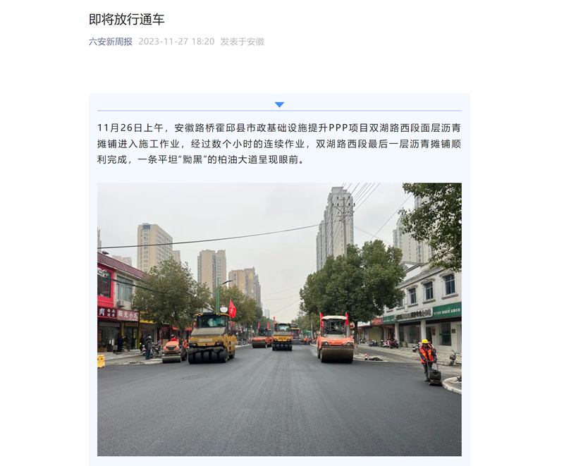 11月26日上午,安徽路橋霍邱縣市政基礎(chǔ)設(shè)施提升PPP項(xiàng)目雙湖路西段面層瀝青攤鋪進(jìn)入施工作業(yè),經(jīng)過(guò)數(shù)個(gè)小時(shí)的連續(xù)作業(yè),雙湖路西段最后一層瀝青攤鋪?lái)樌瓿?,一條平坦“黝黑”的柏油大道呈現(xiàn)眼前。