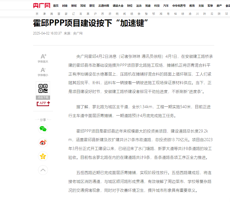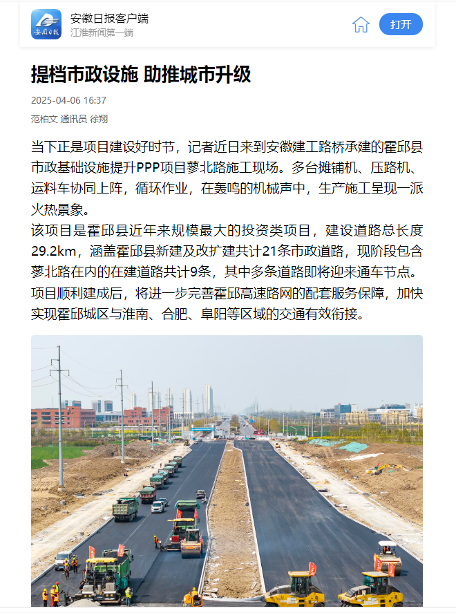 【名媒聚焦】央廣網(wǎng)、安徽日?qǐng)?bào):安徽建工路橋霍邱PPP項(xiàng)目建設(shè)按下“加速鍵”