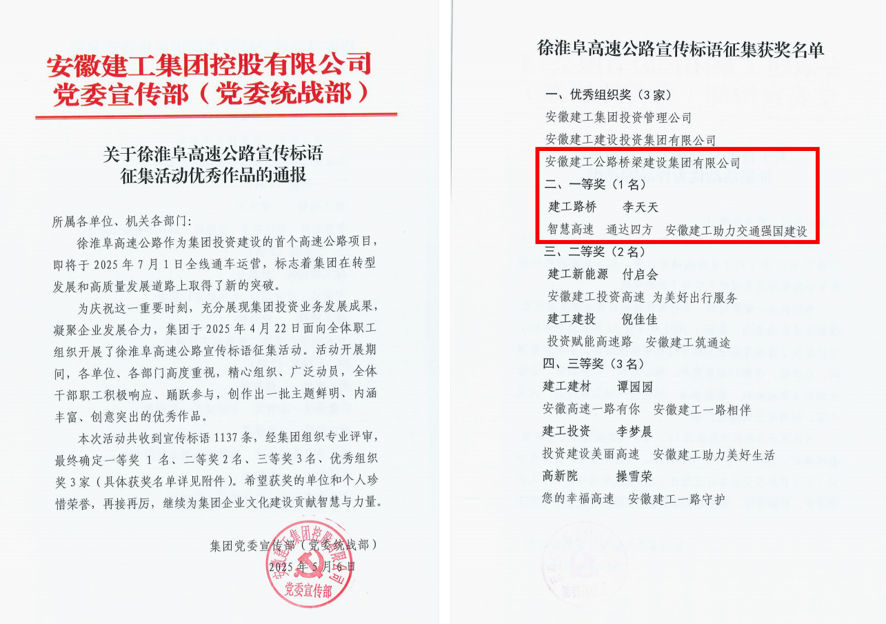 近日,集團徐淮阜高速公路宣傳標(biāo)語征集活動優(yōu)秀作品結(jié)果公布,公司榮獲優(yōu)秀組織獎,報送作品獲評一等獎。