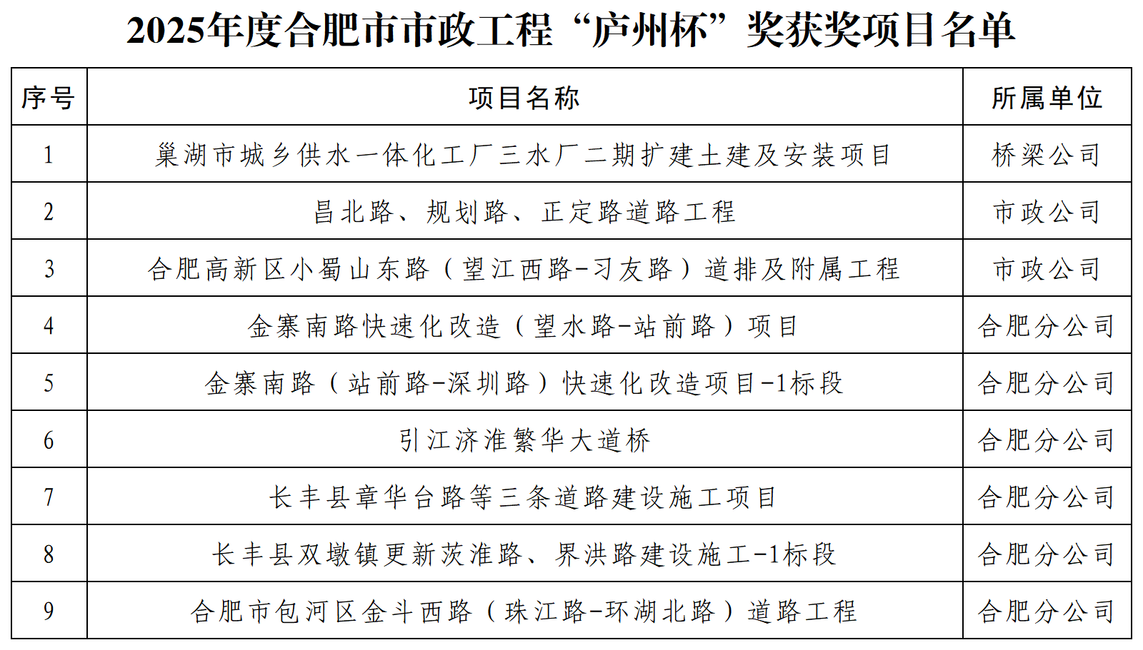 近日,合肥市市政工程協會公布了2025年度合肥市市政工程“廬州杯”獎獲獎項目名單,公司承建的9個項目榮譽登榜。