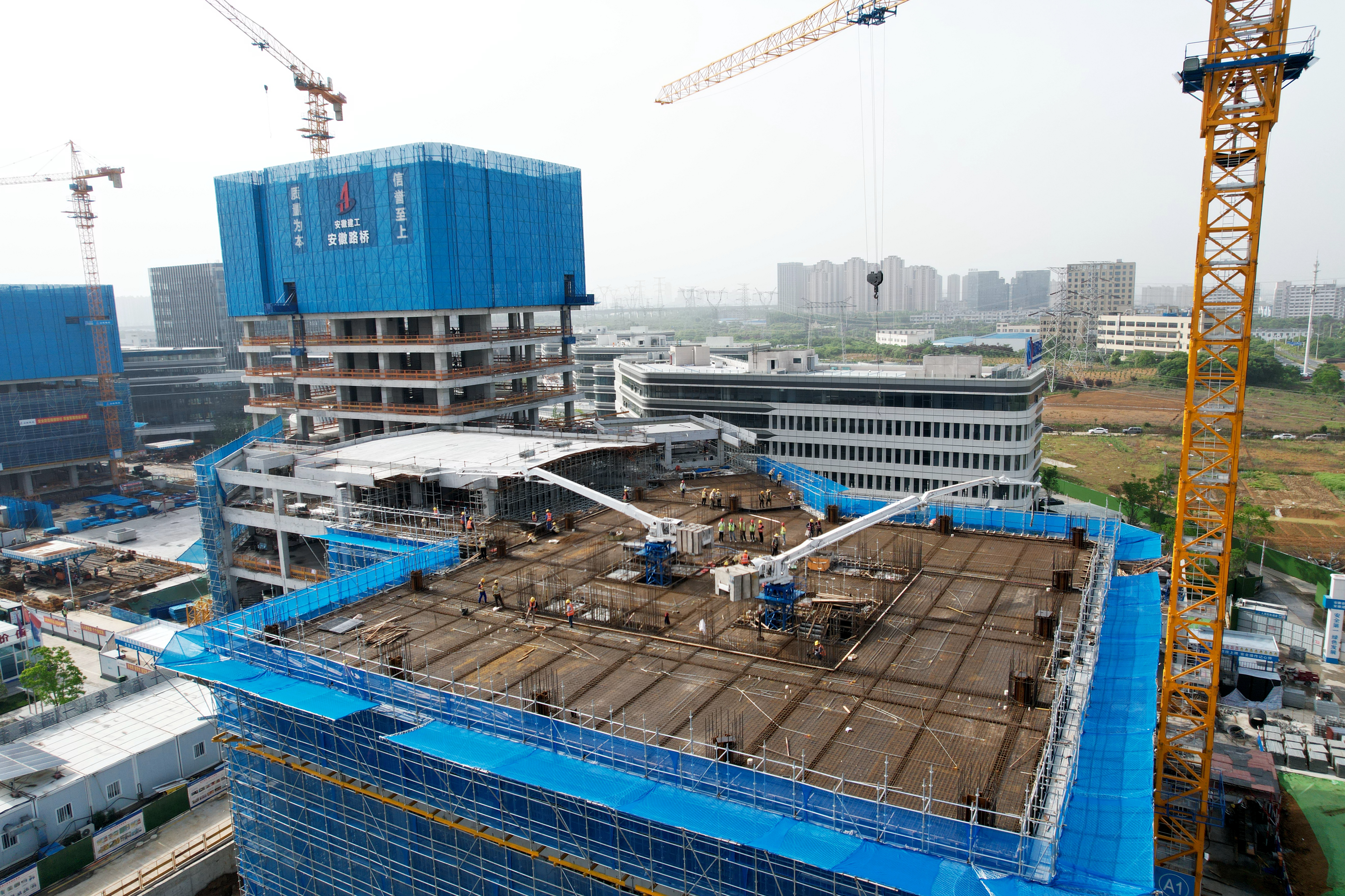 超高層混凝土與全液壓智能布料機施工技術(shù)實現(xiàn)了施工流程的智能化飛躍。布料機獨具匠心地采用3節(jié)臂“Z”形折疊設(shè)計,支持人機協(xié)同可視化遙控操作,實現(xiàn)全方位無死角布料,且不占用現(xiàn)澆板面空間與塔吊設(shè)備資源,澆筑效率大幅提升近50%。這一技術(shù)已在桃花科創(chuàng)產(chǎn)業(yè)園EPC項目成功應(yīng)用,榮獲省級工法,并助力項目榮獲2023年度中國施工企業(yè)管理協(xié)會工程建設(shè)行業(yè)典型案例(智能建造)項目、合肥市智能建造新技術(shù)新產(chǎn)品創(chuàng)新服務(wù)典型案例。