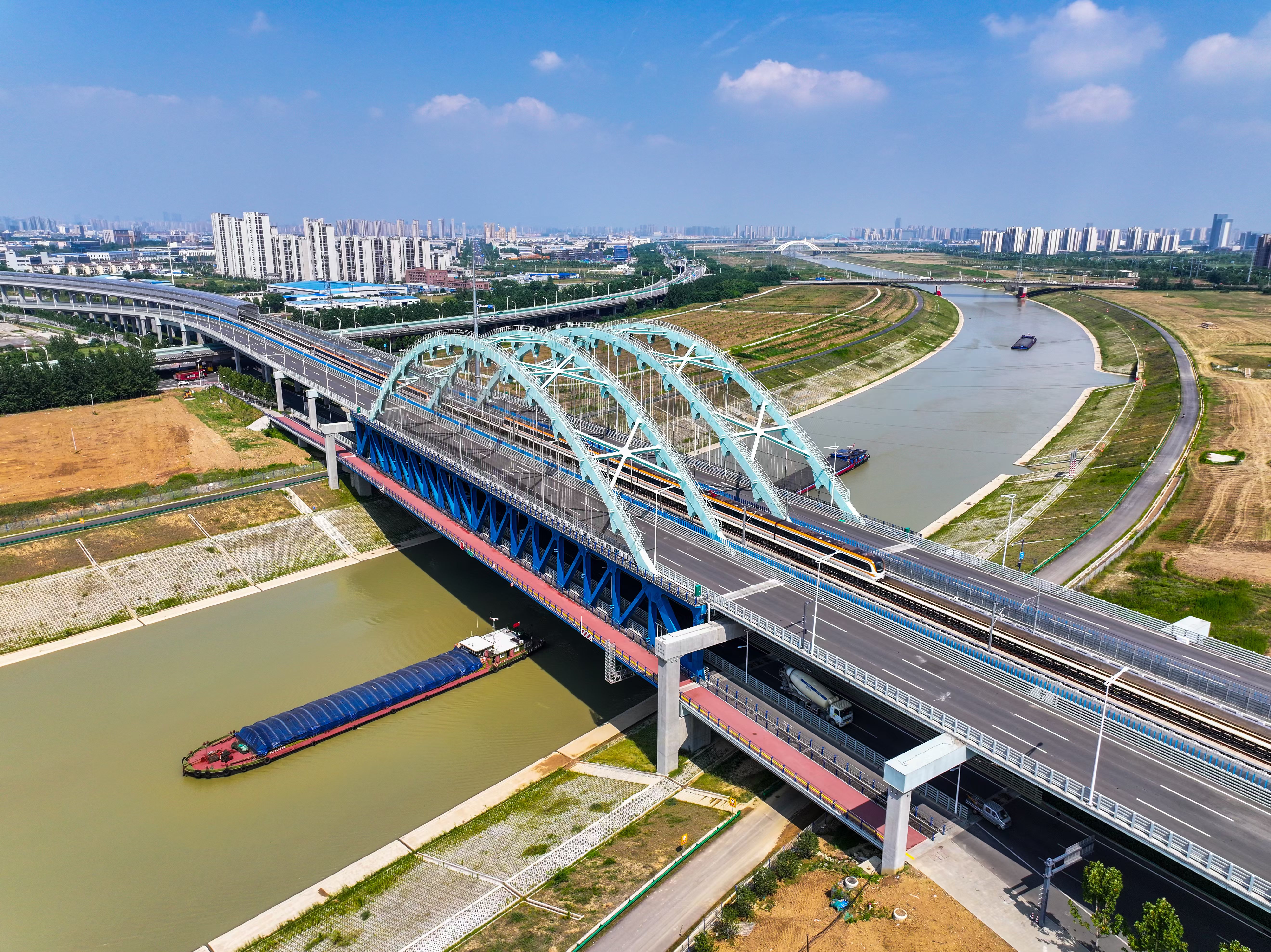 城軌雙層鋼桁架橋由跨中向兩端拱腳合龍施工技術(shù),采用了主橋鋼桁架由跨中向兩端拱腳安裝的新工藝,調(diào)整后的施工方法無需等到墩柱施工完成再進行鋼梁架設(shè),主橋跨中鋼桁架的架設(shè)與兩端承臺墩柱可同步施工,施工進度快。該項技術(shù)成功應(yīng)用于引江濟淮繁華大道橋,有效節(jié)省工期60天,降低成本近90萬元。