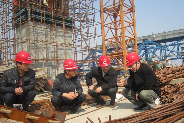 汪總一行深入施工現(xiàn)場,實地查看當前的施工進展情況。在主橋施工現(xiàn)場,汪總仔細詢問了關鍵性節(jié)點工程的施工計劃,現(xiàn)場探討了質(zhì)量、安全管理等問題,并對項目施工可能遇到的難題進行了溝通。