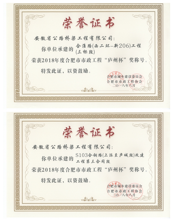 近日,從合肥市市政工程協(xié)會傳來喜訊,安徽路橋公司承建的S103合銅路(上派至廬城段)改建工程、合淮路(西二環(huán)-新206)三標(biāo)兩項工程經(jīng)合肥城鄉(xiāng)建委審定,榮獲2018年度合肥市政工程“廬州杯”獎。