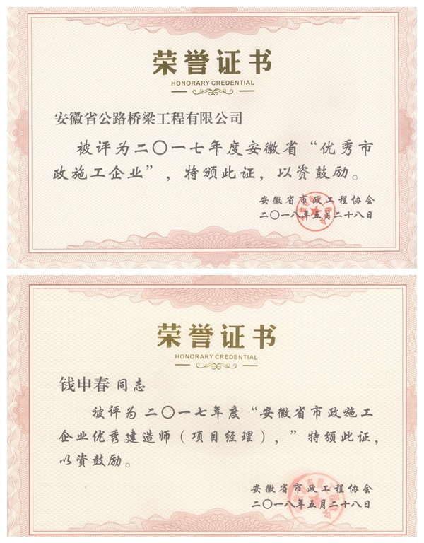 近日,從安徽省市政工程協(xié)會傳來喜訊,公司榮獲2017年度安徽省“優(yōu)秀市政施工企業(yè)”榮譽稱號,錢申春、胡延輝、孫偉三位同志榮獲2017年度安徽省“市政施工企業(yè)優(yōu)秀建造師”榮譽稱號。