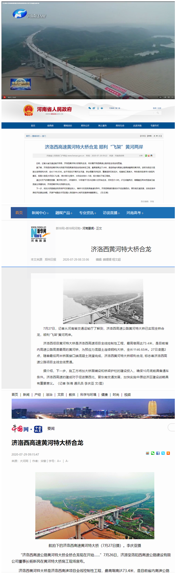 7月26日至27日,中新社、河南衛(wèi)視、河南日?qǐng)?bào)、東方今報(bào)等多家省部級(jí)主流媒體,深入濟(jì)洛西高速黃河特大橋施工現(xiàn)場(chǎng),現(xiàn)場(chǎng)采訪并共同見(jiàn)證了目前河南省內(nèi)墩高最高的黃河特大橋合龍。
