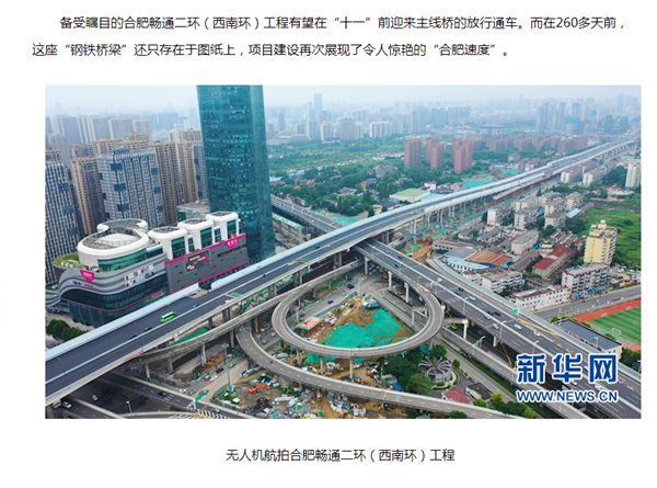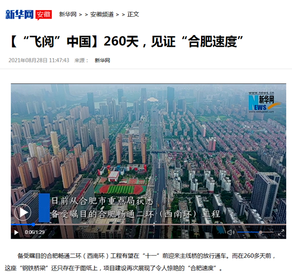 8月28日,國(guó)家級(jí)主流媒體再次聚焦公司承建的重點(diǎn)工程建設(shè),《新華網(wǎng)》以《“飛閱”中國(guó)260天 見證“合肥速度”》為題,報(bào)道了公司承建的暢通南二環(huán)(西南環(huán))項(xiàng)目建設(shè)進(jìn)展情況。