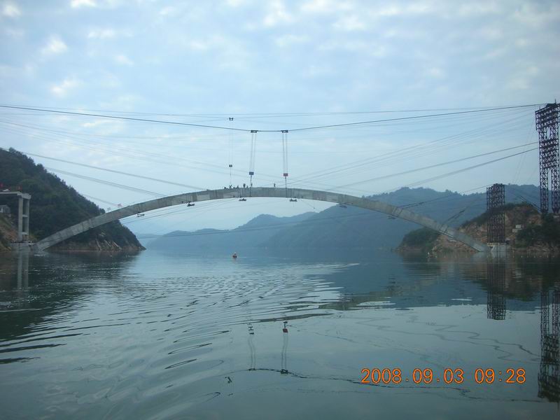 金桃大橋位于金寨縣,跨越梅山水庫(kù)。主橋采用二孔跨度均為160米的上承式鋼筋混凝土箱肋拱,引橋采用跨度13米的簡(jiǎn)支空心板,橋梁全長(zhǎng)491米。由于大橋跨越梅山水庫(kù),箱拱、拱上立柱、系梁、蓋梁全部采用纜索吊裝,施工難度大。