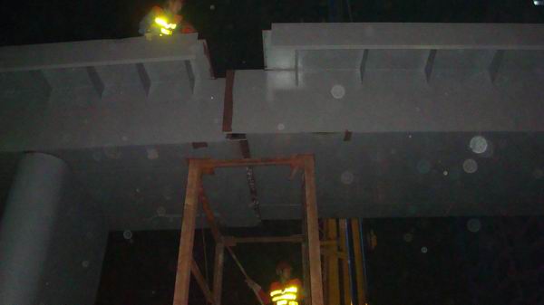晚上2130,運(yùn)梁車準(zhǔn)時(shí)將A梁運(yùn)達(dá)施工區(qū),隨即北一環(huán)南側(cè)在交警的協(xié)助下,按計(jì)劃全封閉。經(jīng)過(guò)近一個(gè)多小時(shí)的安裝,晚上2300整,張洼路天橋施工區(qū)響起了一陣陣掌聲,禮炮隨后騰空燃起——A梁成功安裝了。B梁在隨后的3個(gè)小時(shí)內(nèi)也成功完成安裝。