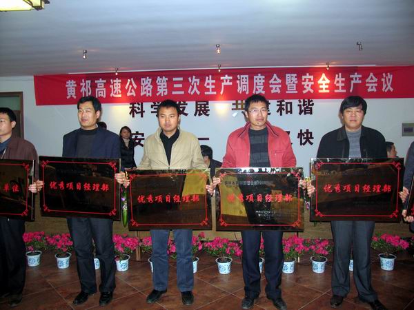 201031,在黃祁高速公路第三次生產(chǎn)調(diào)度會(huì)暨2009年總結(jié)表彰大會(huì)上,安徽省公路橋梁工程公司黃祁高速公路08標(biāo)項(xiàng)目經(jīng)理部獲得安徽省高等級(jí)公路工程建設(shè)指揮部授予的“2009年度優(yōu)秀項(xiàng)目經(jīng)理部”榮譽(yù)稱號(hào),同時(shí)質(zhì)量安全部負(fù)責(zé)人何增華被授予“2009年度優(yōu)秀安全工程師”榮譽(yù)稱號(hào)。